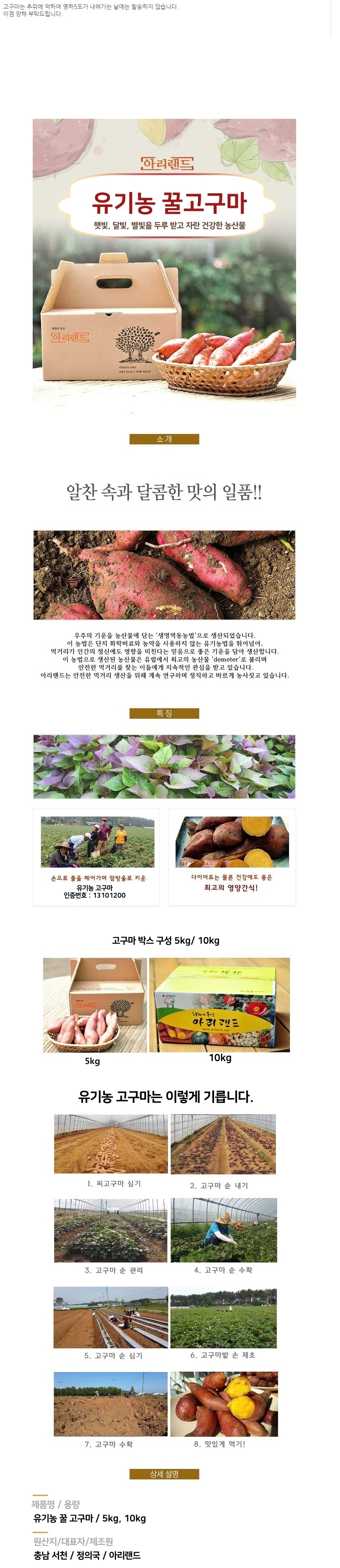 서해바다 바로앞에 위치한 아리랜드 친환경농산물 재배지에서 황토와 모래를 섞어 만든 곳에서 재배 됩니다.